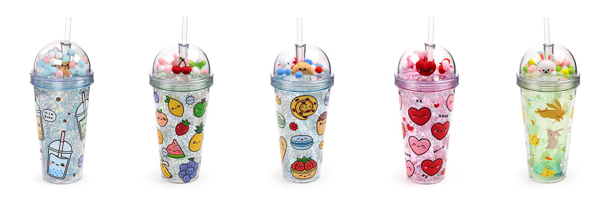 A nossa gama Copos com charms foi selecionada como coleção, abrangendo cinco designs individuais. Estes copos reutilizáveis combinam a praticidade do dia a dia com detalhes de encantos divertidos que criam um impacto imediato na prateleira.