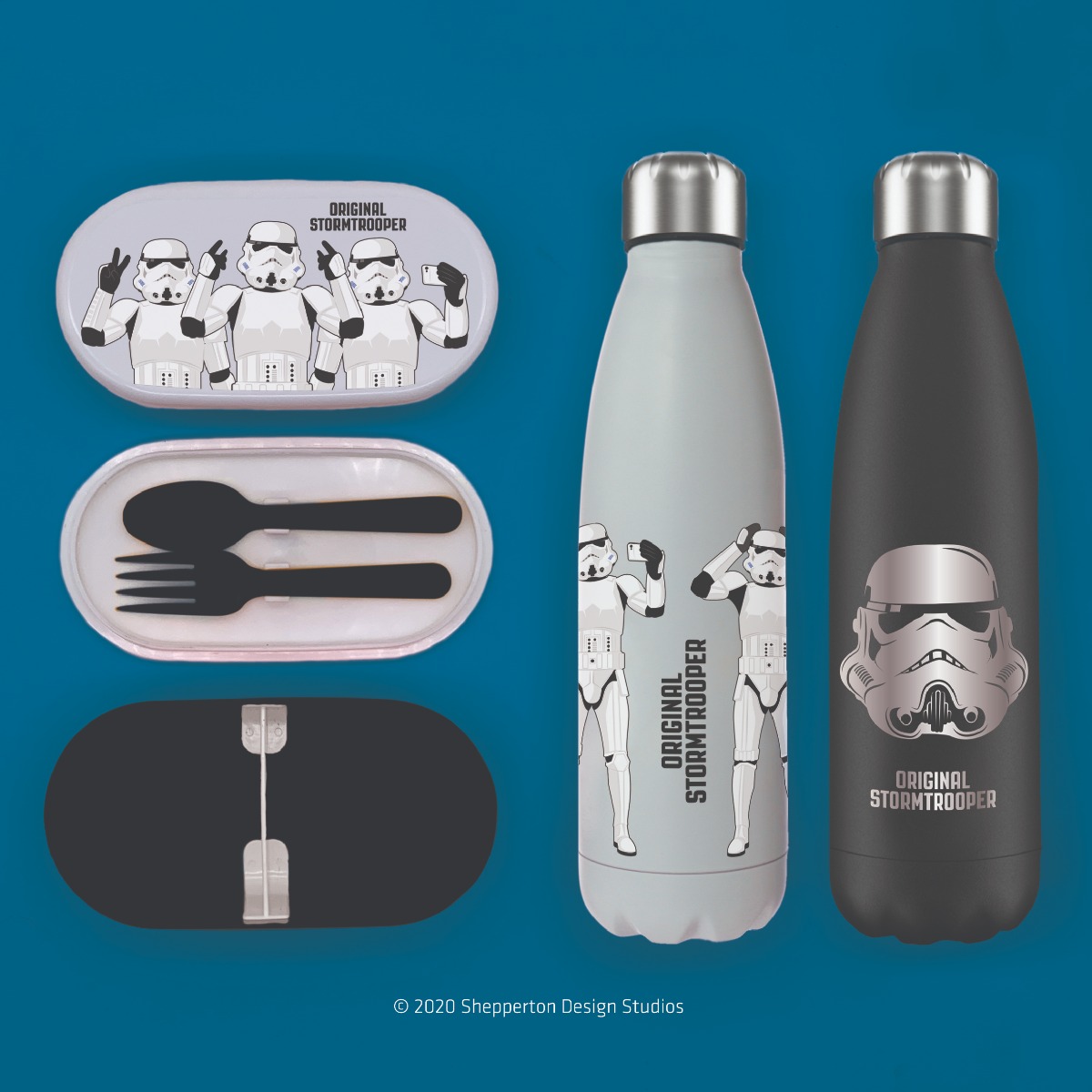 Garrafas apelativas, copos de viagem e lancheiras espelham as cores monocromáticas da roupa stormtrooper, e estas vão destacar-se sozinhas ou como parte da sua exposição Star Wars.