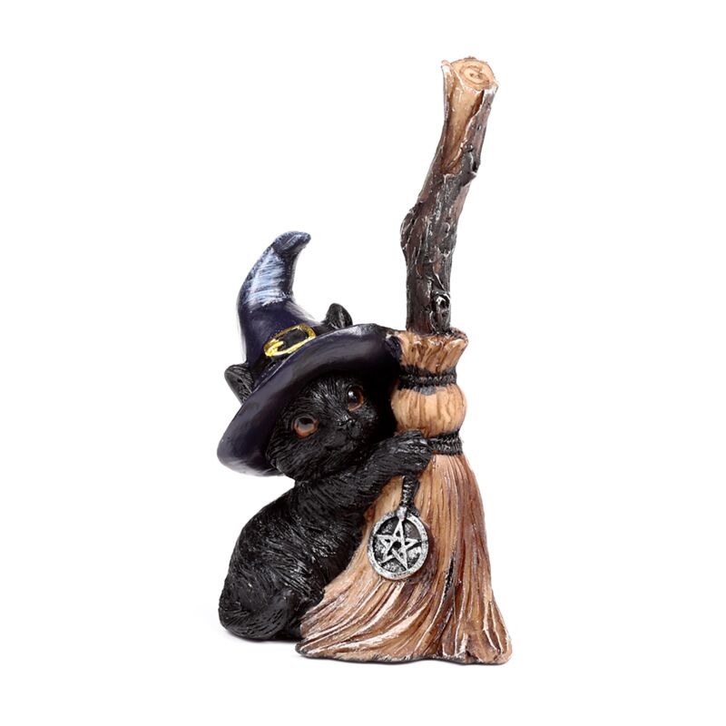 Gato preto bruxo com cabo de vassoura