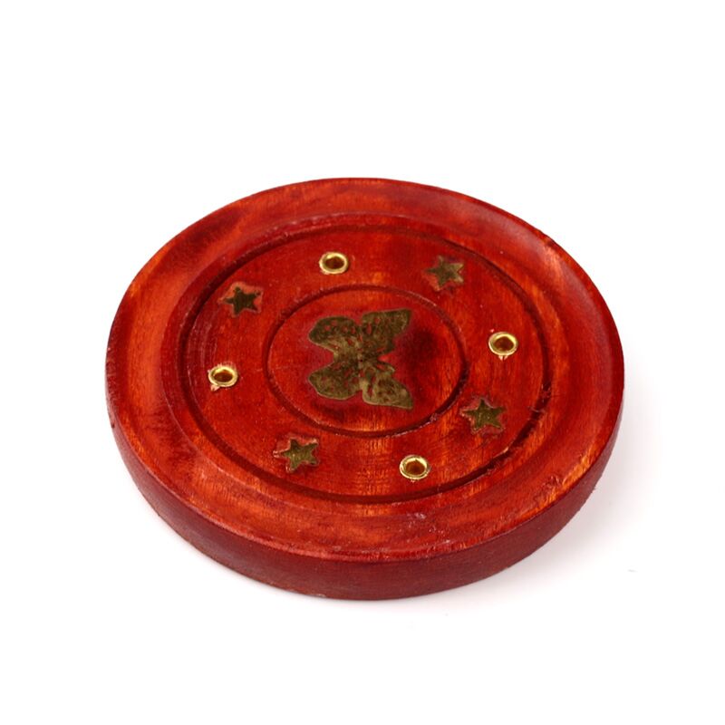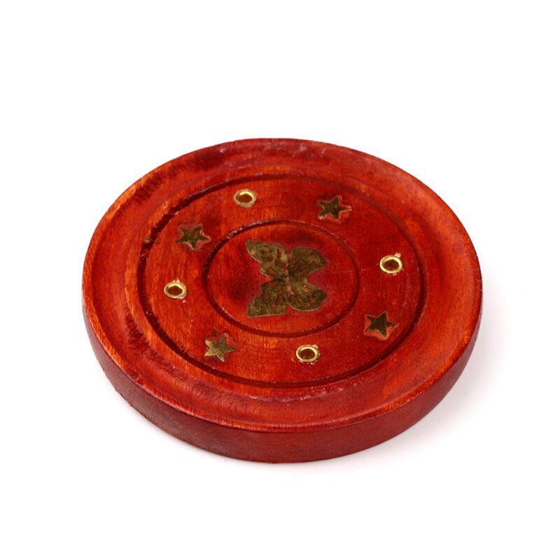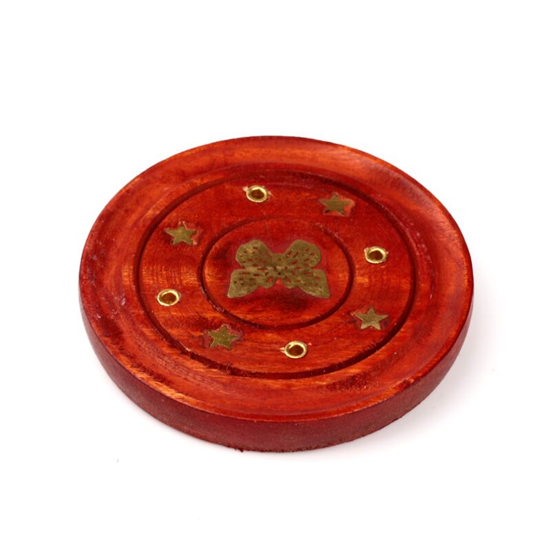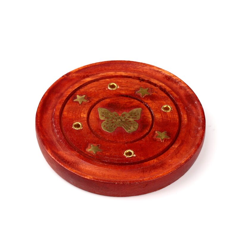Queimador redondo em madeira de Mango com incrustação de borboleta