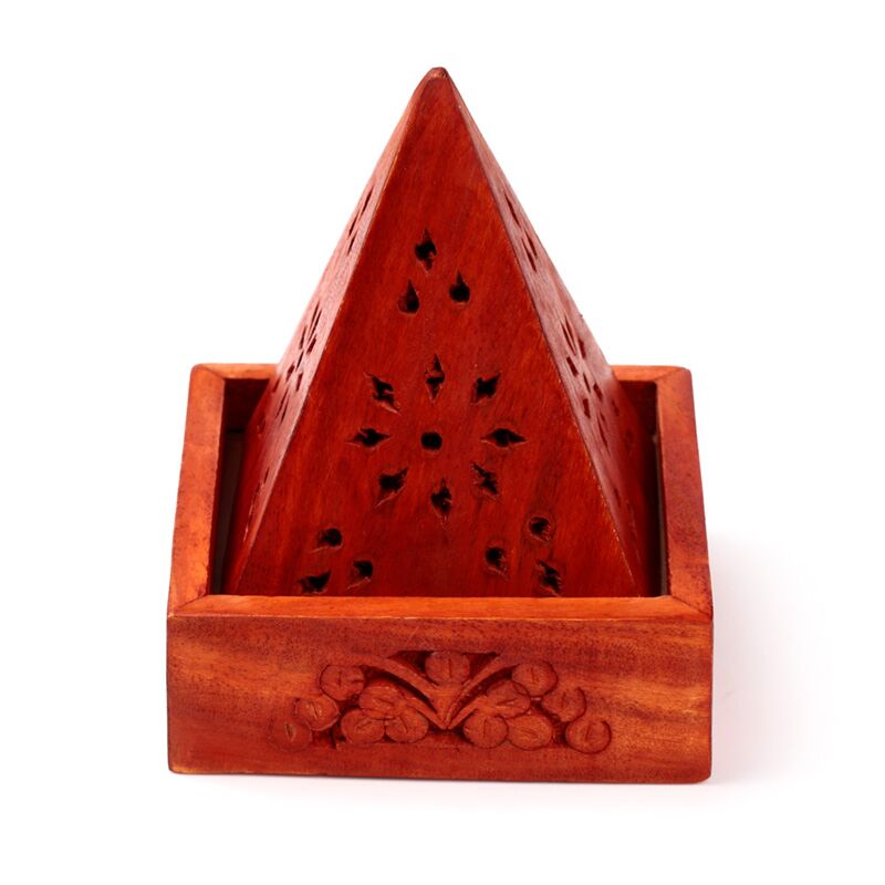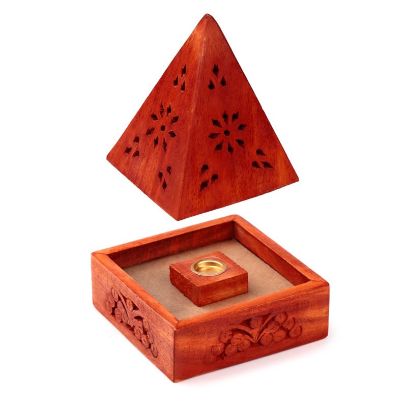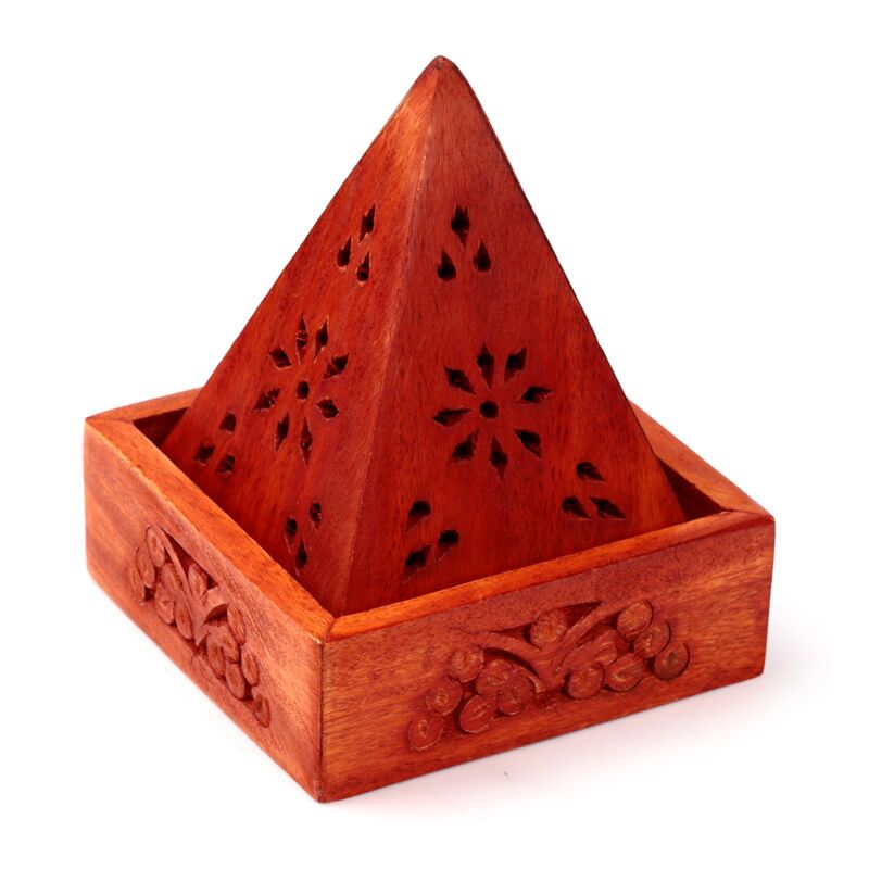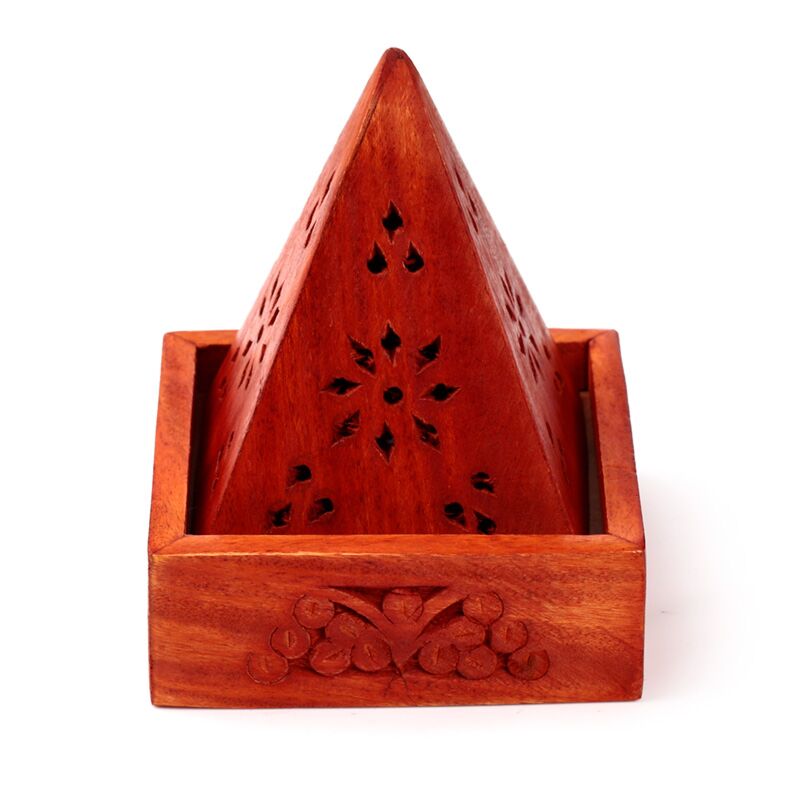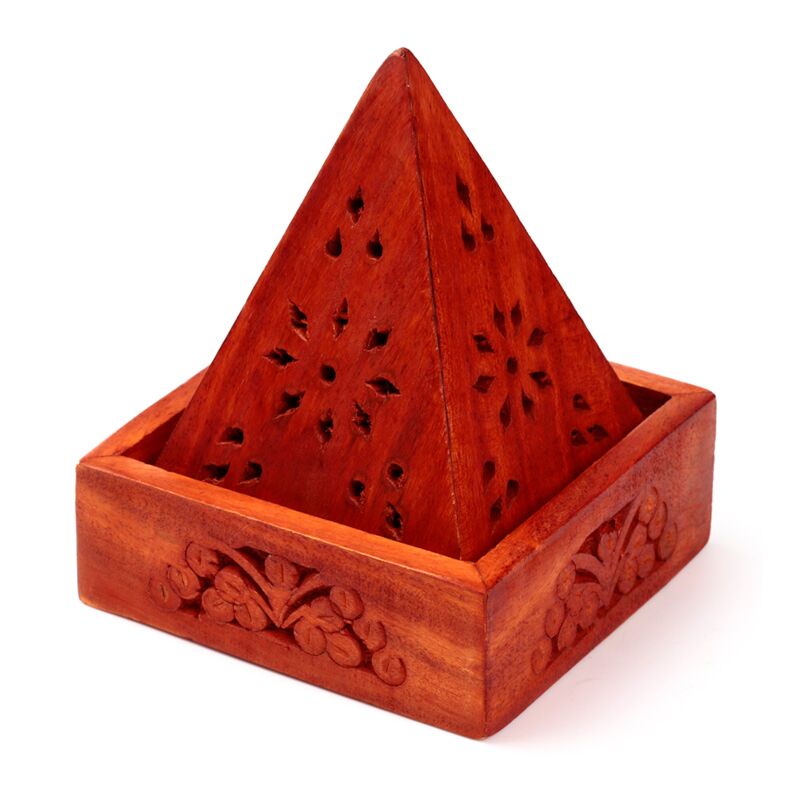 Caixa de incenso em madeira de mango - pirâmide com entalhes de flores