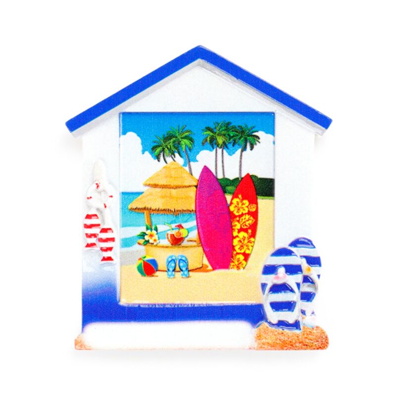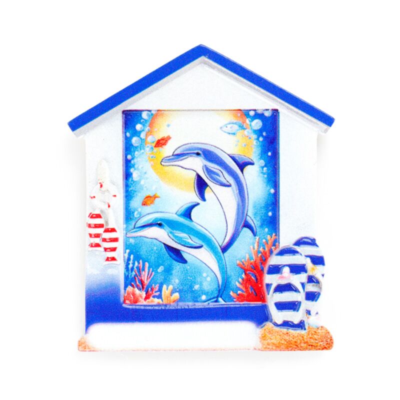 Íman de praia para lembrança Bar de praia em forma de cabana e golfinhos