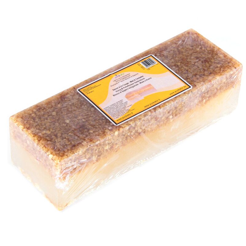 - Embalagem: Vem como um bloco sólido embrulhado em plástico bolha que pode ser cortado em fatias usando um cortador de sabão (não incluído).
