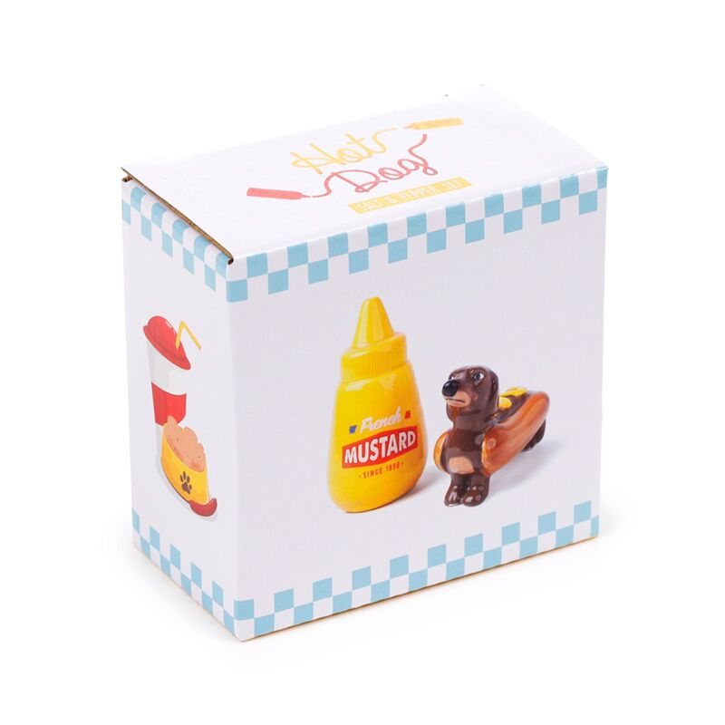 Conjunto sal e pimenta cão - salsisha e cachorro com mostarda